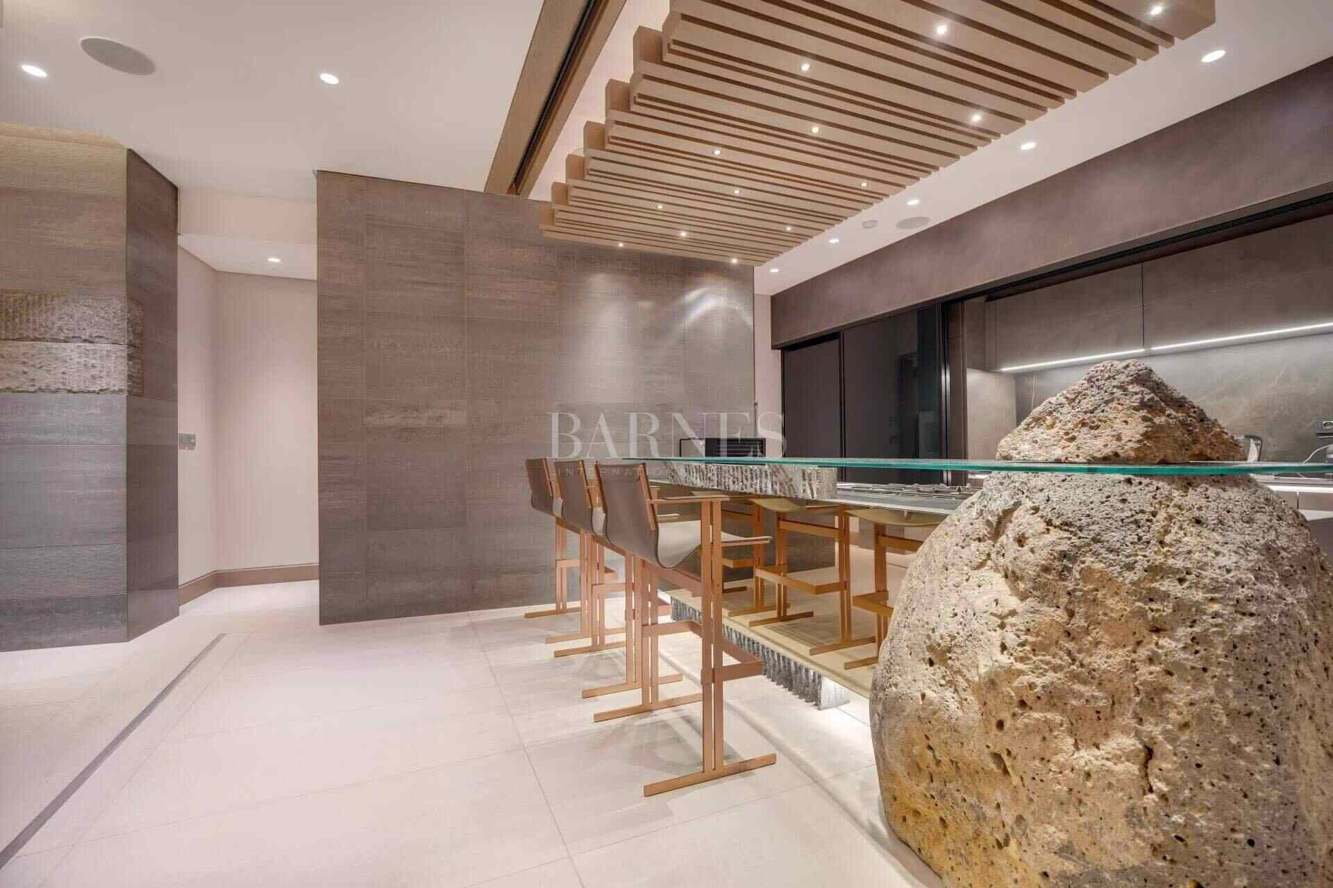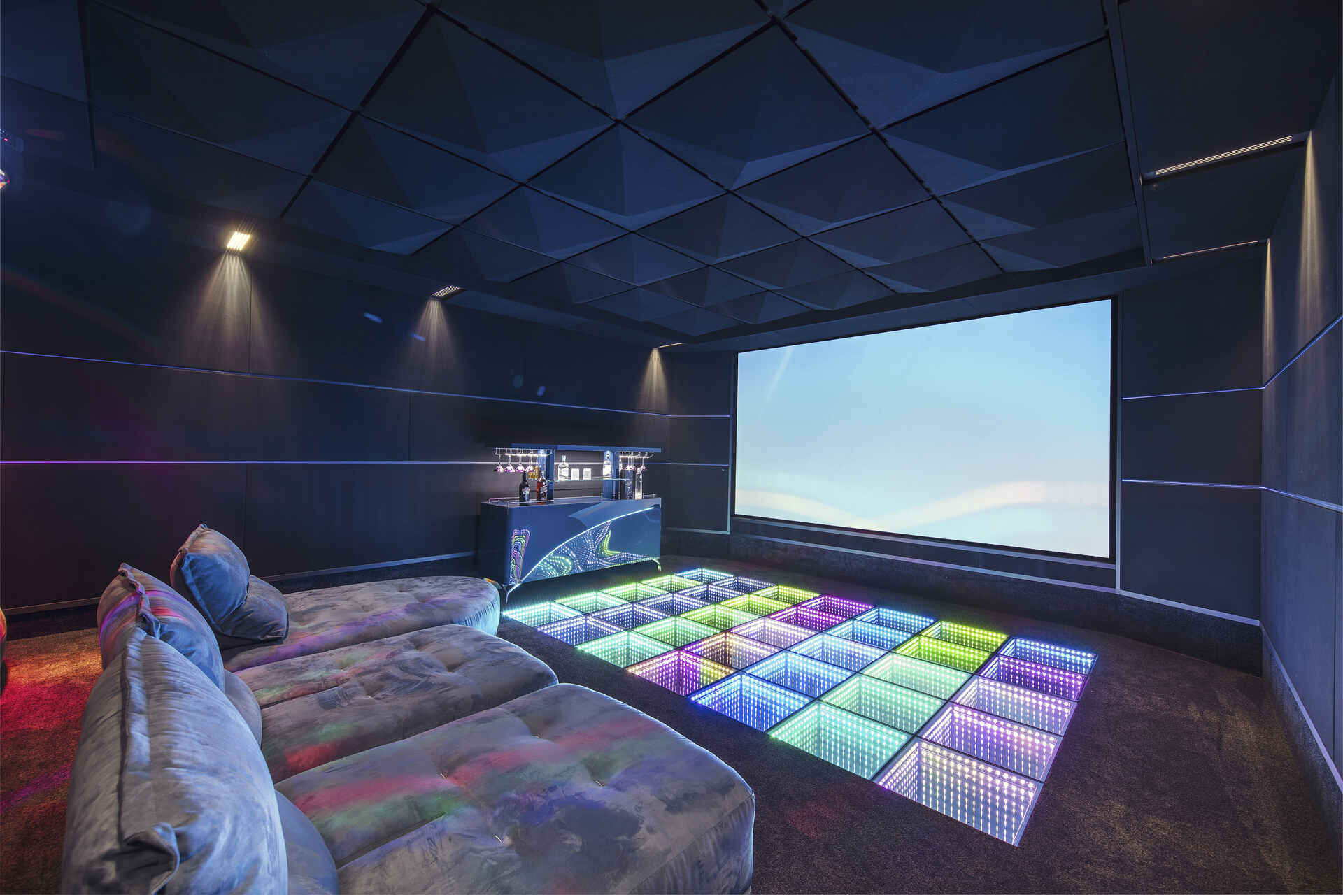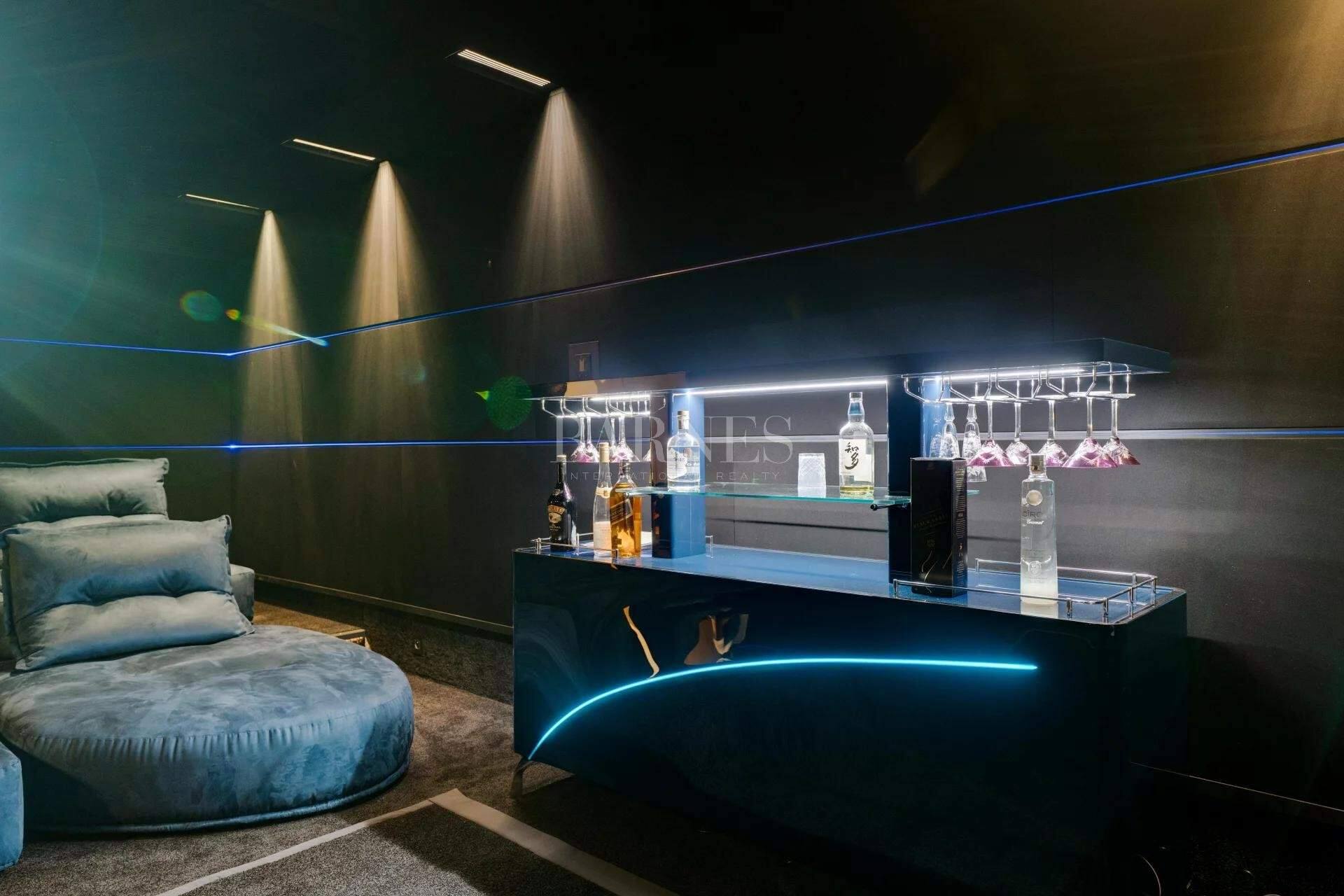 La luxueuse villa dispose d'un espace de vie souterrain où se trouvent une salle de sport, un hammam, un home cinéma pouvant être converti en boîte de nuit avec des sols lumineuse et une cave à vin où vous pourrez siroter une coupe de vin tout en regardant les enfants nager dans la piscine.